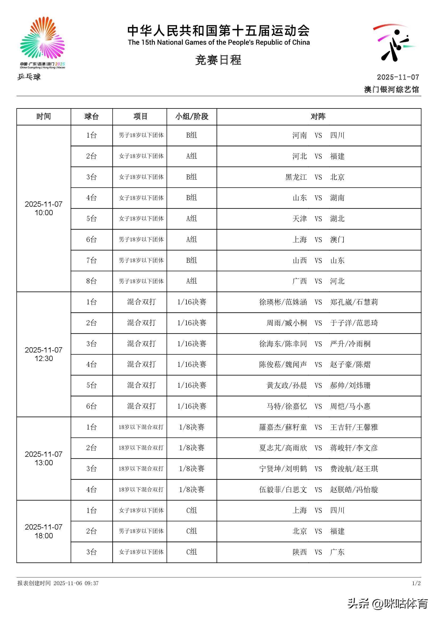 1号台:徐瑛彬/范姝涵 VS 郑孔崴/石慧莉2号台:周雨/臧小桐 VS 于子洋/范思琦3号台:徐海东/陈幸同 VS 严升/冷雨桐4号台:陈俊菘/魏闻声 VS 赵子豪/陈熠5号台:黄友政/孙晨 VS 郝帅/刘炜珊6号台:马特/徐嘉忆 VS 周恺/马小惠20:30 混双1/16决赛对阵:1号台:姚钧涛/吴咏琳 VS 蔡伟/王澜睿2号台:孙闻/钱天一 VS 梁俨苧/何卓佳3号台:赵钊彦/孙铭阳 VS 韩欣沅/王一朵4号台:刘丁硕/孙艺祯 VS 郑培锋/李仁思佳5号台:牛冠凯/王姝 VS 曹彦涛/石洵瑶7号台:薛飞/王晓楠 VS 何俊辉/关卓琳咪咕视频11月7日-20日全程直播全运会乒乓球比赛,精彩对决不容错过。